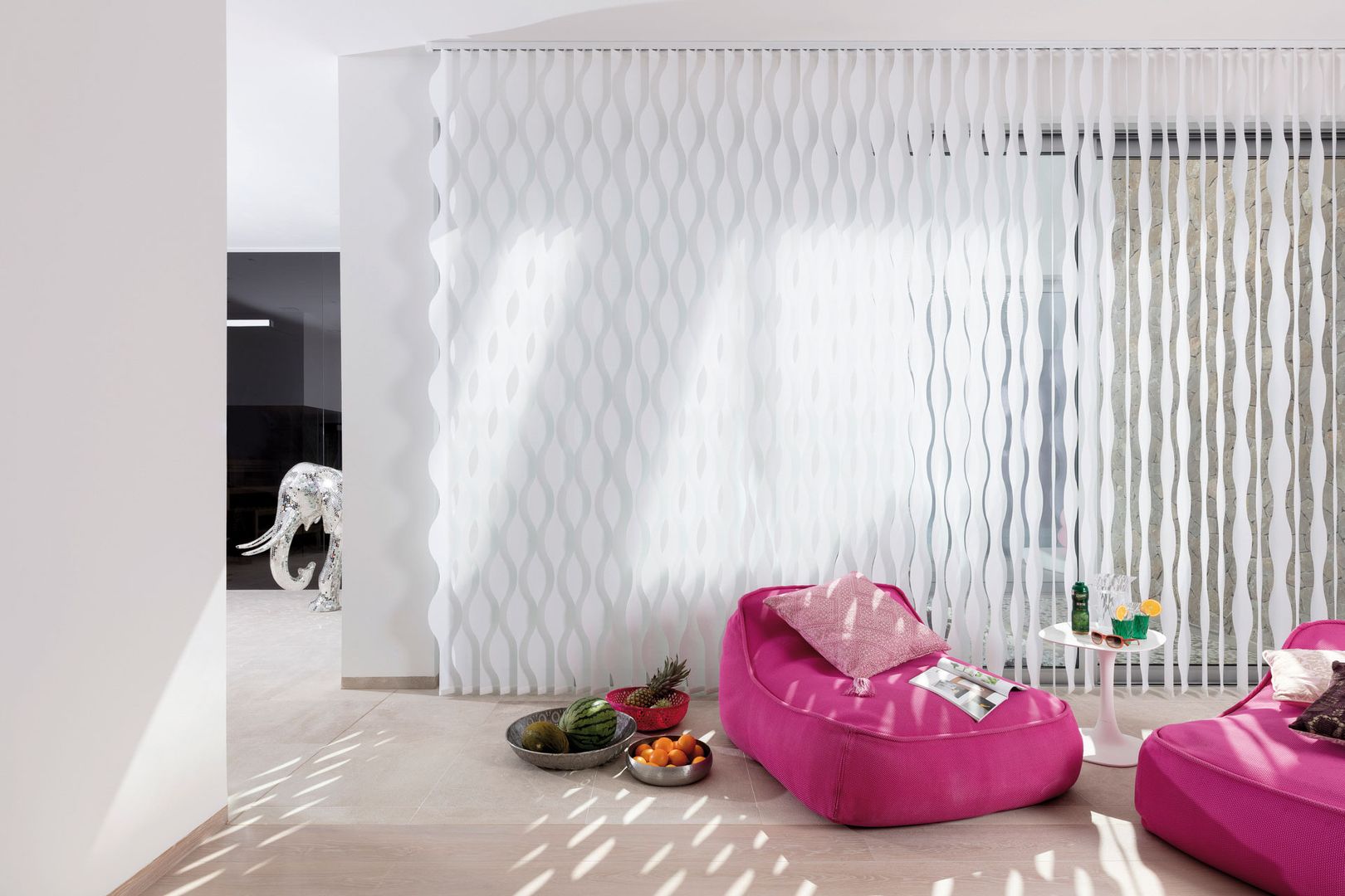 Wie wirkt ein Raum höher? Indem man das Vertikale betont. Diesem einfachen Gesetz folgt die Vertikaljalousie und schafft durch ihre großzügigen Lamellen ein Gefühl von Höhe, Freiheit und Luftigkeit. Sehr reduziertes Design und eine minimalistische Formensprache schaffen ein puristisches Ambiente, das Raum für Funktionalität lässt. Deshalb sind Lamellenvorhänge vor allem im Objektbereich und in der modernen Architektur sehr beliebt. Funktional sorgen sie für maximalen Sonnen- und Hitzeschutz, wobei durch die je nach Sonneneinstrahlung breiteren oder schmäleren Sichtschlitze - je nach Regulierung der Lamellen - für den nötigen Durchblick nach außen gesorgt und umgekehrt die Privatsphäre gesichert ist. Das Streulicht sorgt für ein angenehmes Lichtklima.
